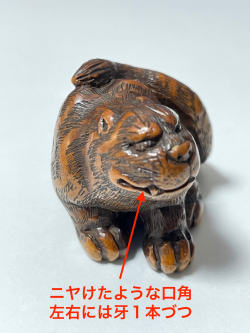 口角はニヤけたように波打っており、左右に牙が1本づつ出ている。 (私の根付も同様)
