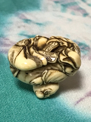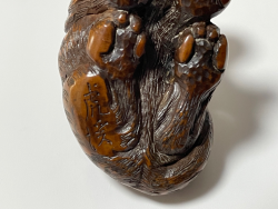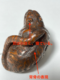 背骨の表現らしきものがある。 耳は小さくて寝ている。(私の根付も同様)